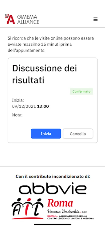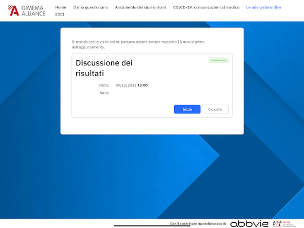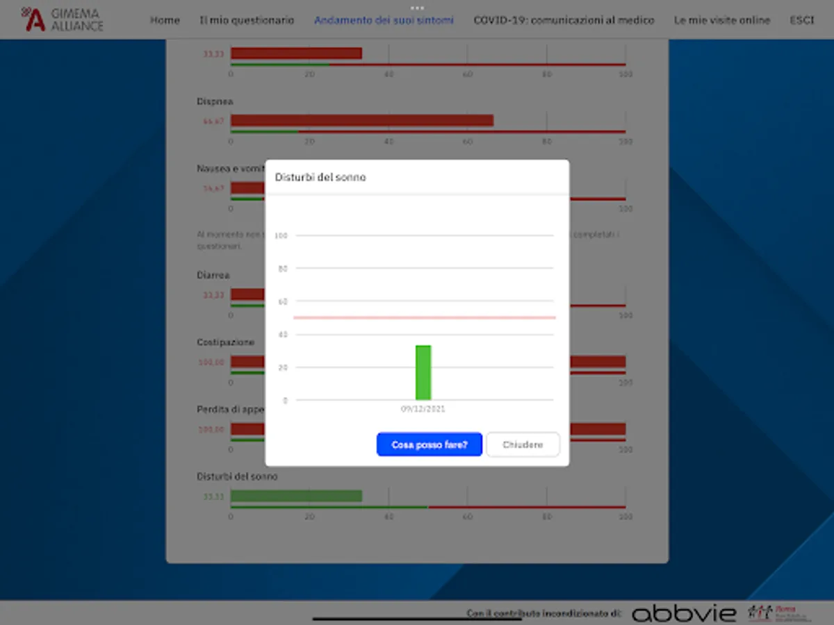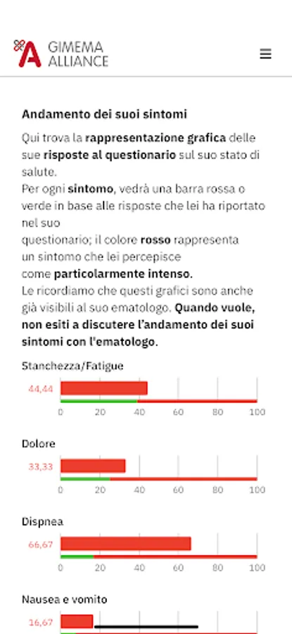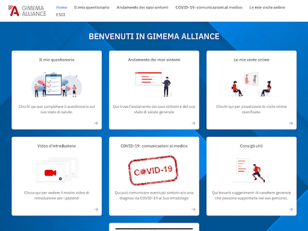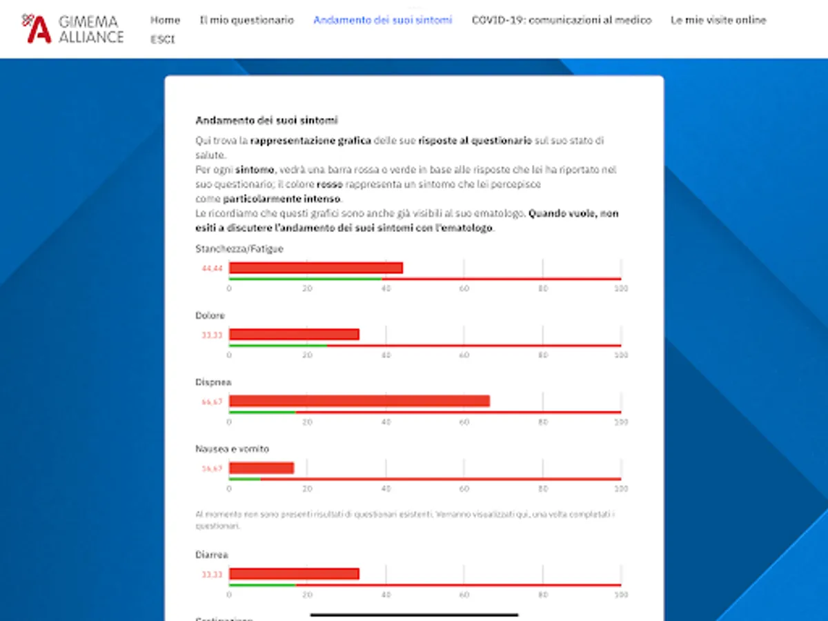 GIMEMA-ALLIANCE is a digital platform (https://alliance.gimema.it) that allows hematological patients to better monitor their health and symptoms. The patient can graphically see the results of the progress of his symptoms over time and also keep track of any changes in his state of health. Within the platform, the patient has the opportunity to fill out short questions about their state of health, the results of which can be seen in real time by the hematologist with whom the patient is being treated. In this way, the haematologist is helped to better understand the patient's real state of health, even from a distance, and can then better discuss with his patient which are the symptoms that are most important to him.