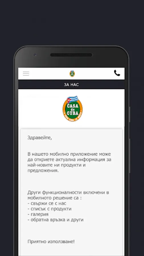 ☆ Кубинските барове са истинска сцена за безкрайни празници и екзотична наслада. "A Toda Cuba Le Gusta" - е мотото ни в Casa de Cuba. Богатият избор от коктейли по автентични рецепти, винтидж, но ненатрапчив интериор, специално селектирано музикално оформление и сърдечното отношение на нашите cantineros зад бара ще ви помогнат да усетите атмосферата на истинското кубинско настроение. Препоръчваме да опитате коктейлите Мохито, Ел Президенте и любимото на Хемингуей Дайкири.Качественият подбор на ром и уиски, както и селекцията ни от кубински пури ще допълнят по неповторим начин приятното ви прекарване в Casa de Cuba. ☆