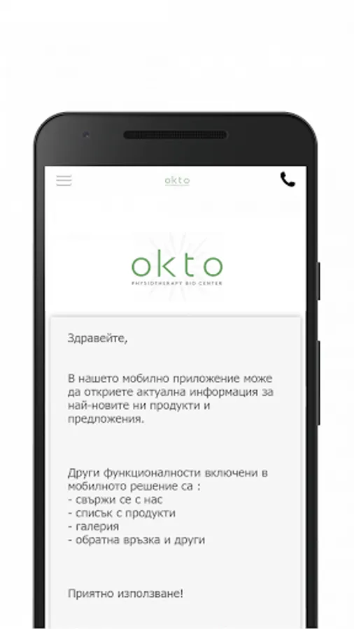 „OKTO” е създаден с цел лечение, възстановяване, поддържане и грижа за физическото здраве на нашите пациенти. Центърът разполага с квалифицирани специалисти по Кинезитерапия (Физиотерапия) и Физикална медицина, с последно поколение висококачествени апарати за Физиотерапия (Електротерапия, Ултразвуковатерапия, Deep oscillation) на немската фирма Physiomed, която е водещ производител на оборудване в областта на рехабилитацията и не на последно място използваните масажни олиа са с био произход.