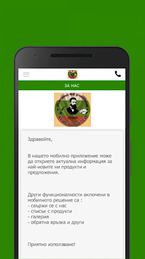 The 62nd elementary school "Hristo Botev" was founded in the spring of 1880. It currently has 11 classrooms, one workshop and a gym. 242 students in 13 classes are trained. The school staff is 27 people, incl. 20 educators. The patronage of the school is June 2 (the day of Hristo Botev). The school maintains a good tradition for every 1st day students to plant one birch tree in the schoolyard.