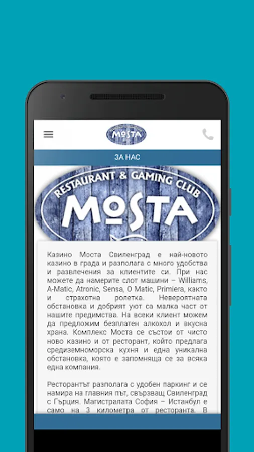 Casino Svilengrad Bridge is the newest casino in town and has many amenities and entertainment for its clients. Here you can find slot machines - Williams, A-Matic, Atronic, Sensa, O Matic, Primiera, and great roulette. The incredible atmosphere and good coziness are a small part of our benefits. Every customer can offer free alcohol and delicious food. Mosta Complex consists of a brand new casino and a restaurant that offers Mediterranean cuisine and a unique setting that is memorable for every company.