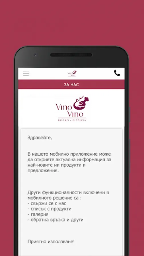 Вино Вино е кокетен ресторант, в центъра на столицата, в близост до храм Св. София. В заведението може да се насладите на ястия от типа домашна кухня. Тук може да се опитате прясна паста, свежи салати, домашна баница и вкусни десерти. Акцент в менюто на заведението е богатият избор на вина, предимно български. Всяка седмица има избрано вино на промоция. Тук може да се отпуснете под звуците на музикални изпълнения, добра храна и прекрасно вино. Ресторантът предлага разнообразно обедно меню. Подходящо място за приятелски срещи, семейни празненства и бизнес обяди.