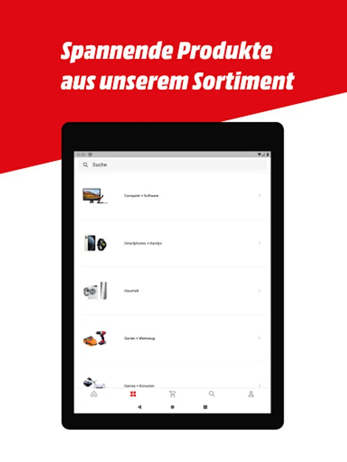 • Access the entire range of the online shop - divided into categories - and have the availability displayed in the MediaMarkt in your area.