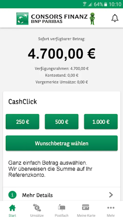 - You need a credit card account from Consors Finance. If you do not already have one, you can request it directly from the login page of the app ("No customer yet?").