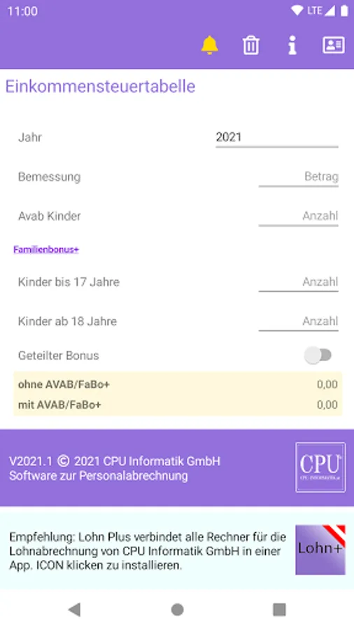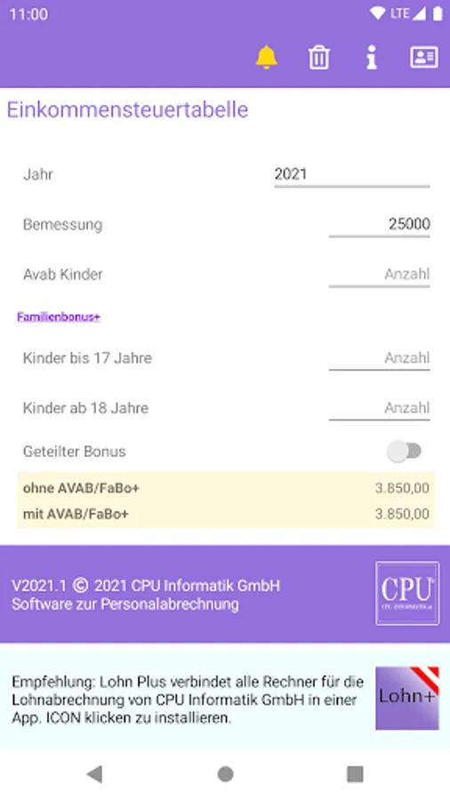 The entry of the annual income tax base is required. The result is given out for both sole earners and without sole earners.