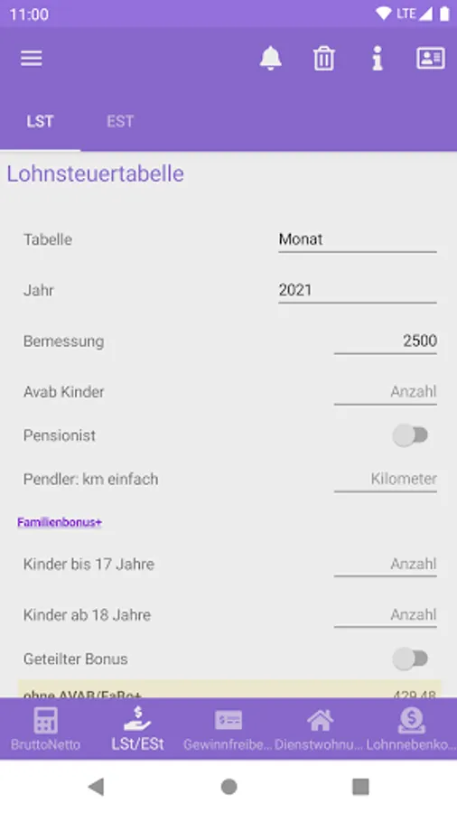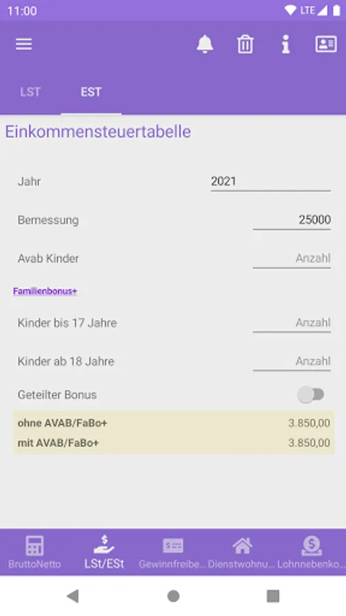The entry of the annual income tax base is required. The result is given out for both sole earners and without sole earners.