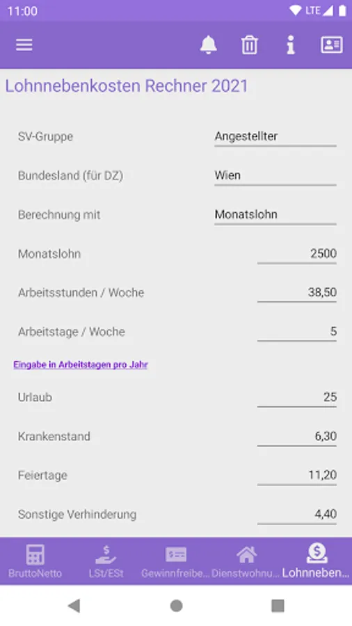 The calculator calculates the ancillary wage costs for Austria. The ancillary wage costs are determined both on the basis of the attendance time and on the basis of the gross monthly salary, as well as the hourly labor costs for performing an hourly rate calculation.