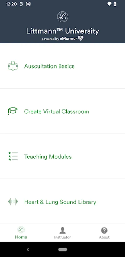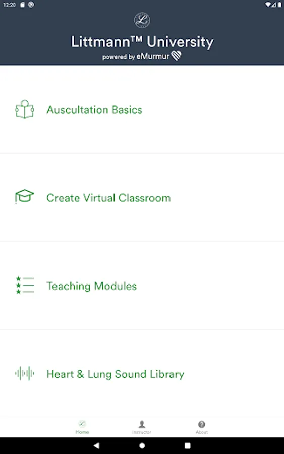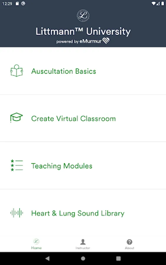 Littmann University - powered by eMurmur - is the app for auscultation education. Now educators can have access to heart and lung sounds, learning modules and more - anywhere, anytime. The app gives users access to real patient heart and lung sounds to help educate and test the recognition of benign and pathological sounds.