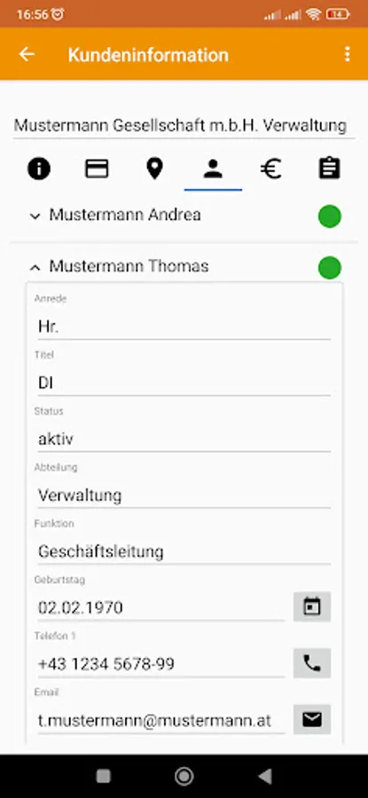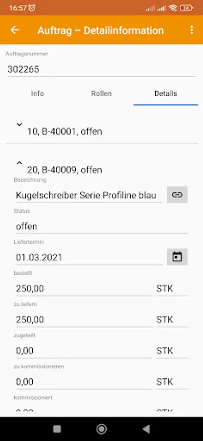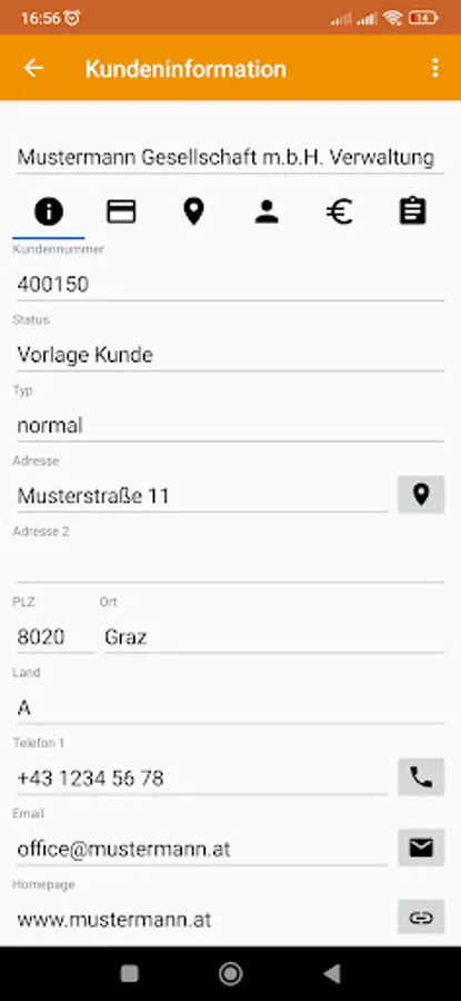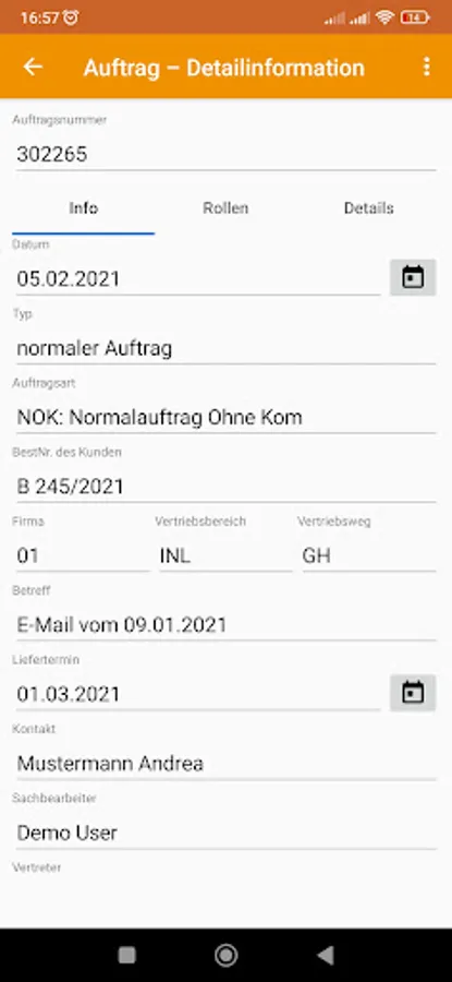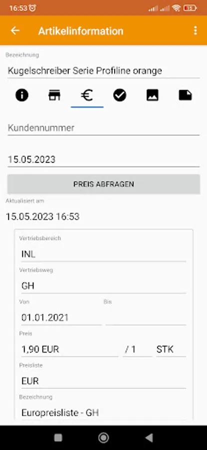 See the most important data of your customers, such as addresses, terms and conditions, contact details and contact persons and contact the people directly from the APP. Information about the historical and current offers and orders of the customer bring you up to date.