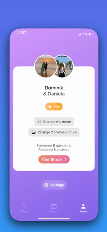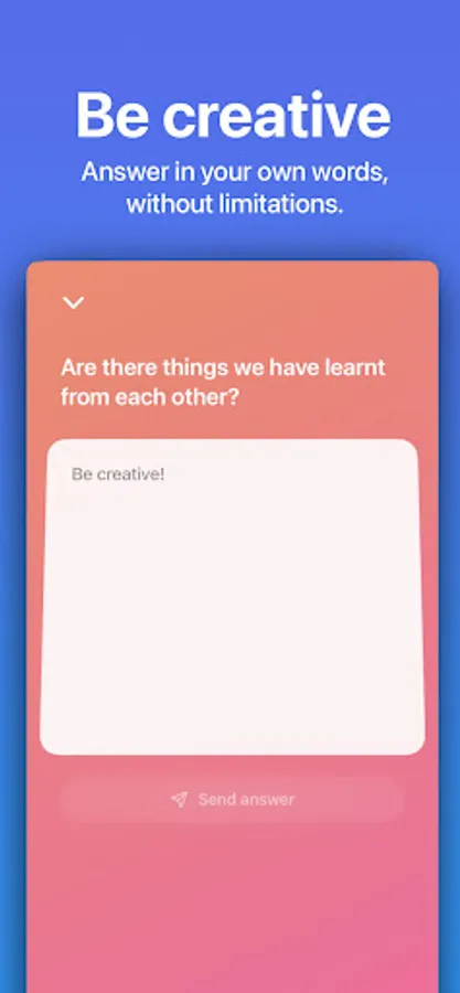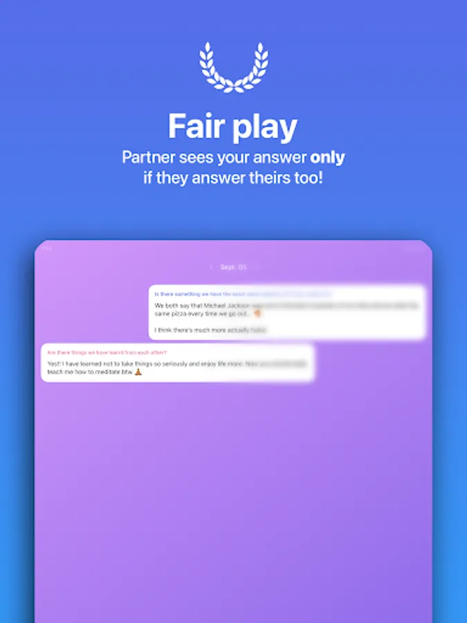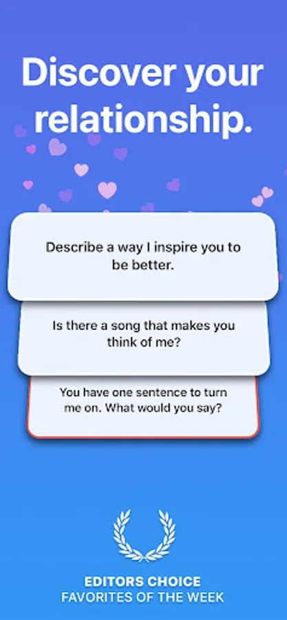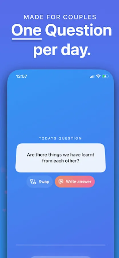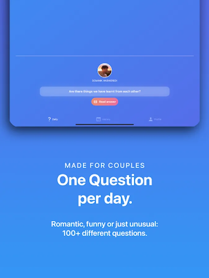 You and your partner get ONE random question per day - it might be about yourself, the partner or just the relationship.