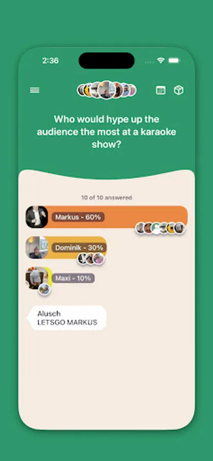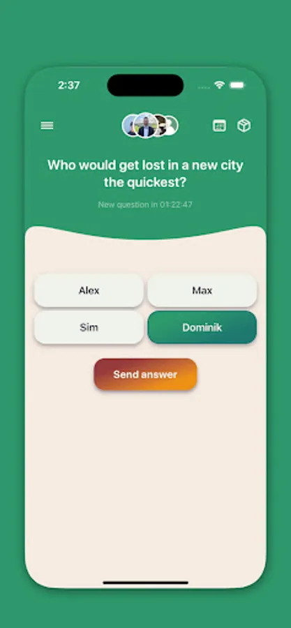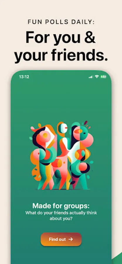 Spice up your group chats with AskUs, the ultimate friend-poll app! Answer thought-provoking daily questions or polls about your friends, then vote and see the results for endless entertainment. Perfect for groups of 3 or more. Connect, laugh, and bond over newfound insights into each other's personalities and quirks.