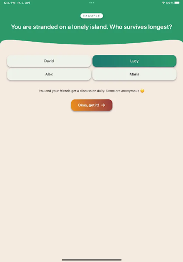 Discover new things about your friends as you explore topics ranging from humorous hypotheticals to lighthearted debates. Break the ice in new group chats, rekindle old connections, or simply add a dash of fun to your everyday conversations.