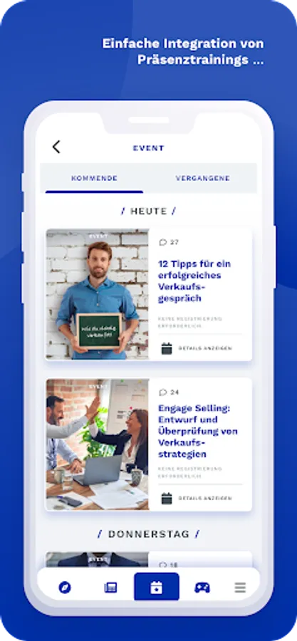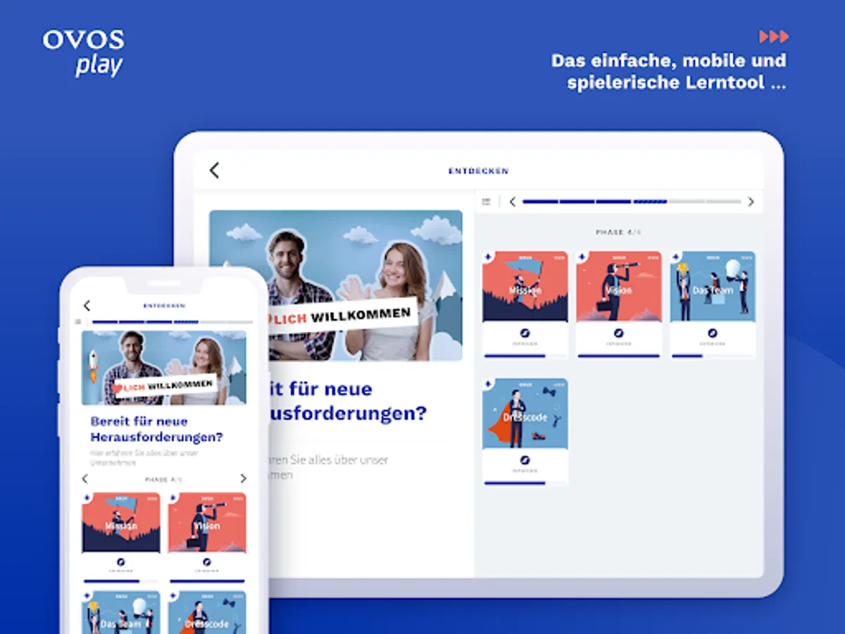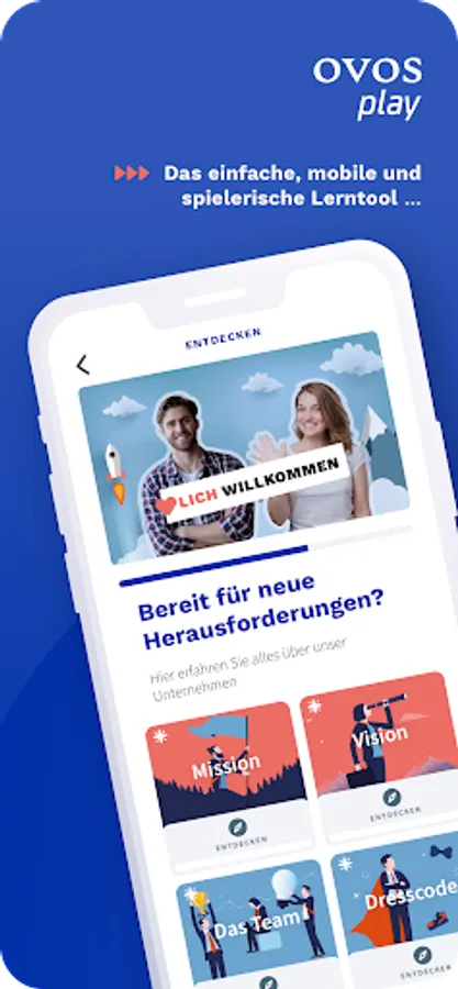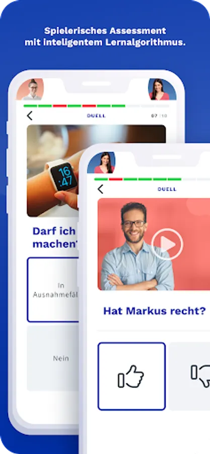 Appealing and interactive learning units (micro-training) are shown on a variety of learning cards (text, image, video, 3D, VR, scene, dialogue, tasks and decisions) and continuously checked in a multiplayer quiz duel. Learned knowledge is consolidated in the long term.