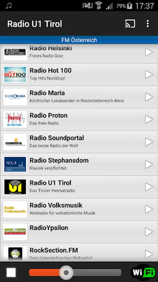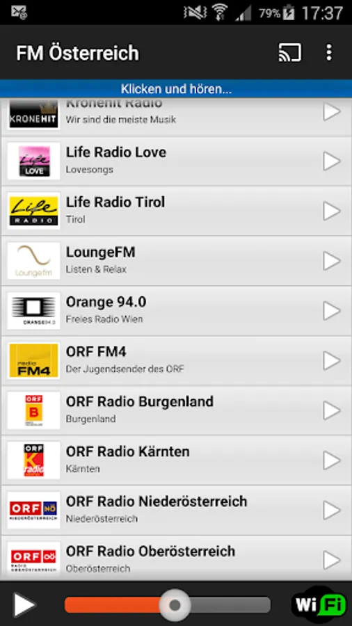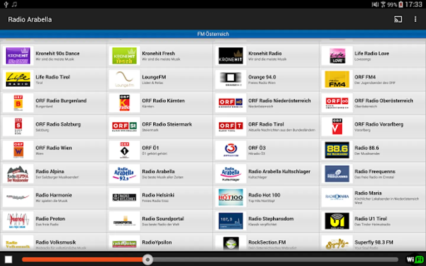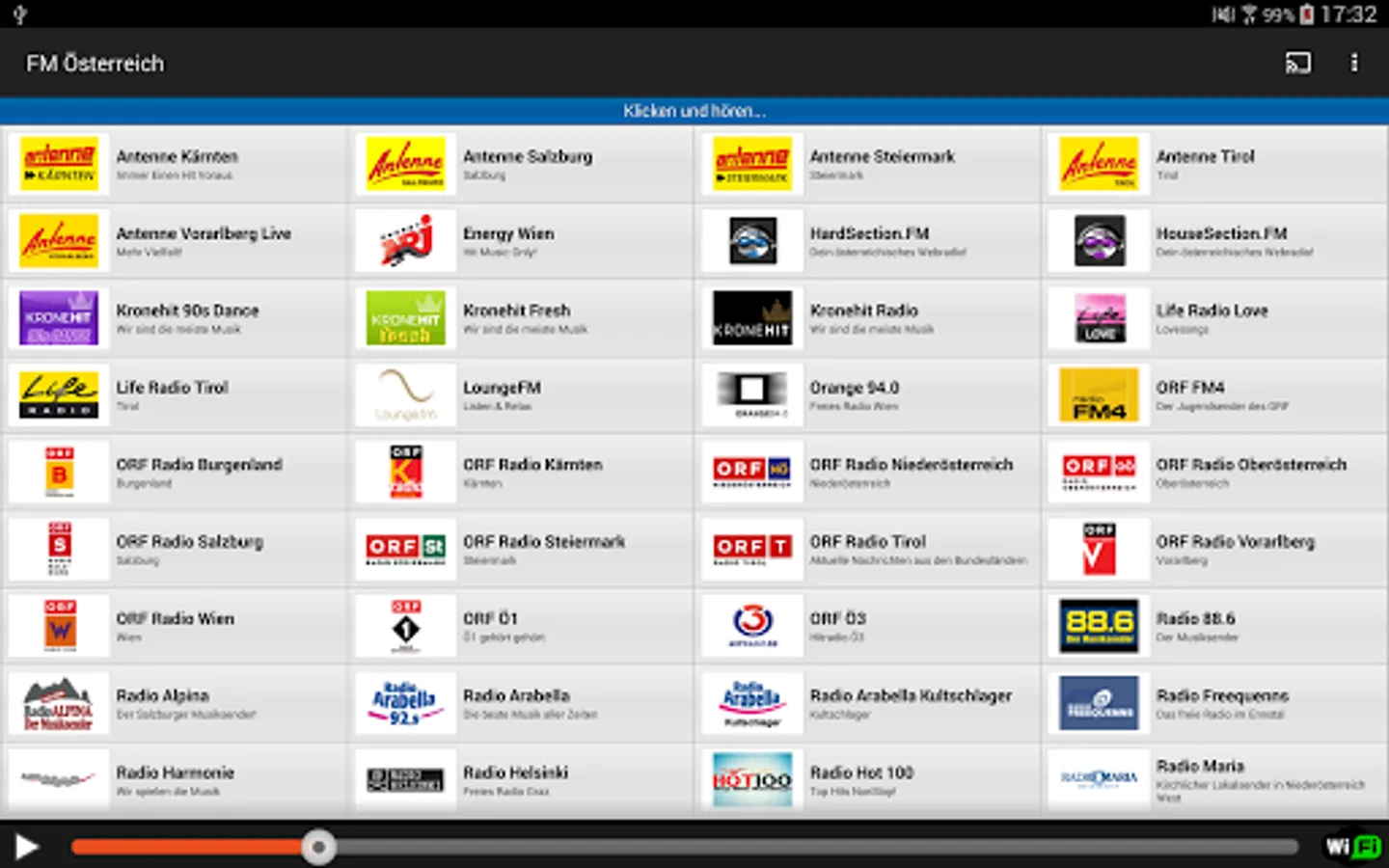 ORF Radio Tirol, ORF Ö1, Kronehit Radio, Radio U1 Tirol, ORF Radio Steiermark, LoungeFM, Radio Arabella, ORF Radio Vorarlberg, Life Radio Love, ORF Radio Burgenland, ORF Radio Wien, ORF Radio Lower Austria, Radio Helsinki, Radio Folk Music, WAVE 1 Linz, Radio Sound Portal, Antenne Kärnten, Antenne Vorarlberg Live, Antenne Steiermark, Radio Stephansdom, Radio Harmony, Life Radio Tirol, ORF Radio Kärnten, HouseSection.FM, Energy Vienna, Alpina radio, Radio Proton, Antenne Tirol, Kronehit 90s Dance, ORF Radio Upper Austria, Radio FREEQUENNS, ORF FM4, HardSection.FM, Radio Maria, RadioYpsilon, ORF Radio Salzburg, Hitradio Südtirol, RockSection.FM, ORF Ö3, Radio Arabella cult hit, Antenne Salzburg, Orange 94.0, Kronehit Fresh, Radio Hot 100, Radio 88.6, 98.3 Superfly FM.