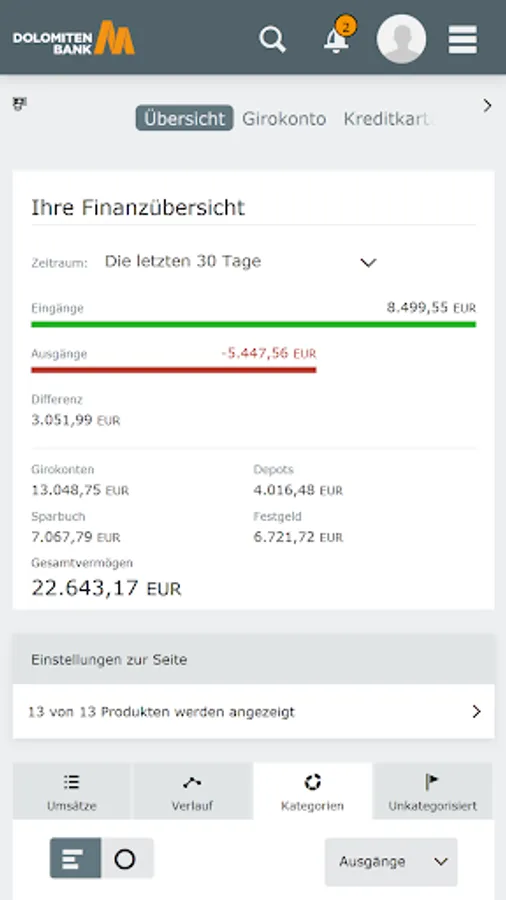 - Quick overview of current accounts, savings products, brokerage accounts, credit cards, insurance. the representation by graphic illustration of revenues or assets is supported.