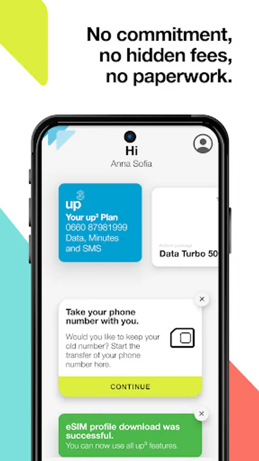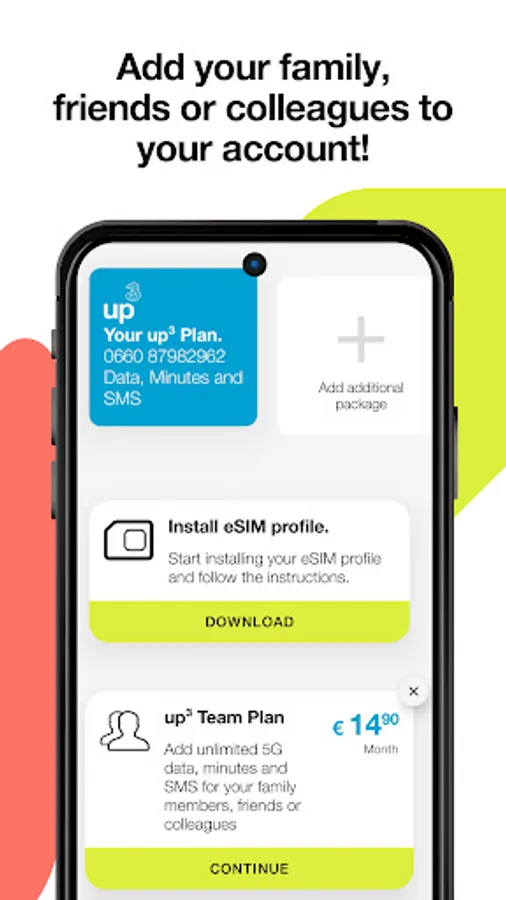 Installing physical SIM cards is a thing of the past! With up, you can now download your eSIM profile directly to your device and unleash unlimited power in just a few minutes. Without having to go to the shop, without any paperwork, without extra fees. Simply complete your subscription directly in the app, download your eSIM profile and “up” you go!