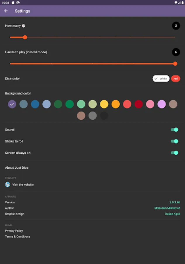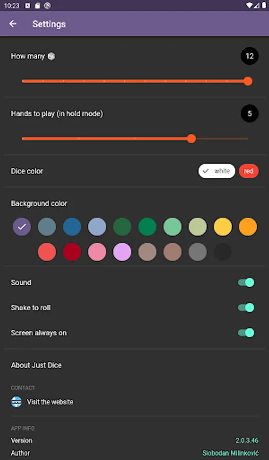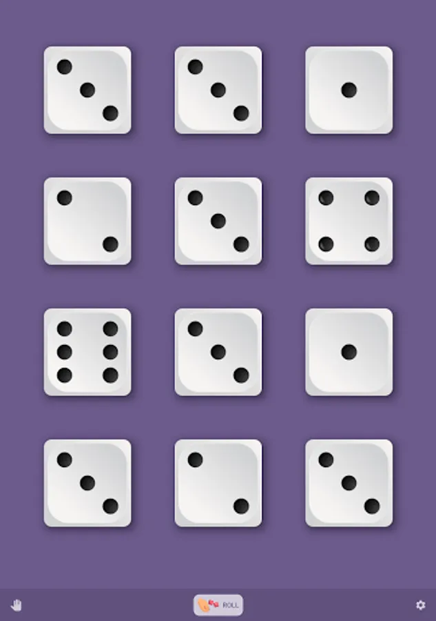 You can throw as many as 12 dice. The sum is on the screen. There's a hold mode, to hold the dice between the throws (up to six throws). Also, the screen can be always-on. You can enable Shake-to-throw, pick a background color, turn the sound on and off, and choose your dice color.