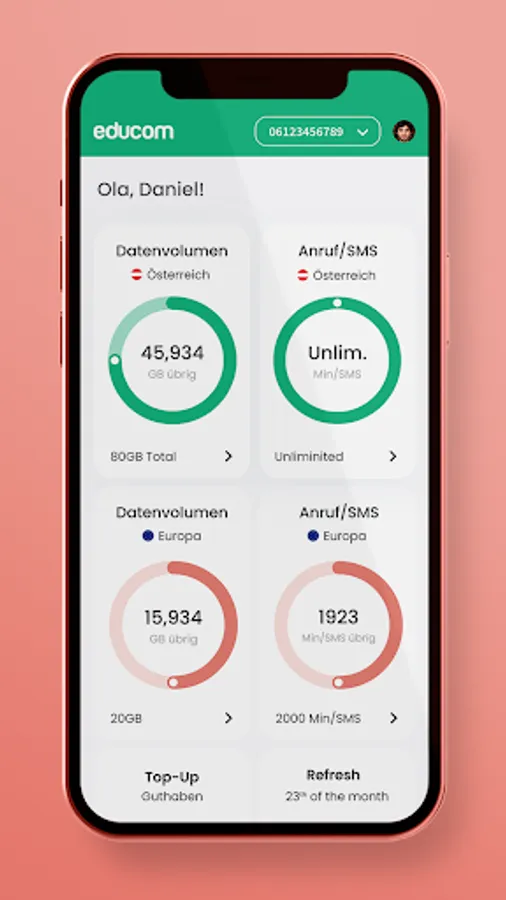 With the educom app you always have a full overview of all your costs, customer data, free minutes and settings. The following features are included: