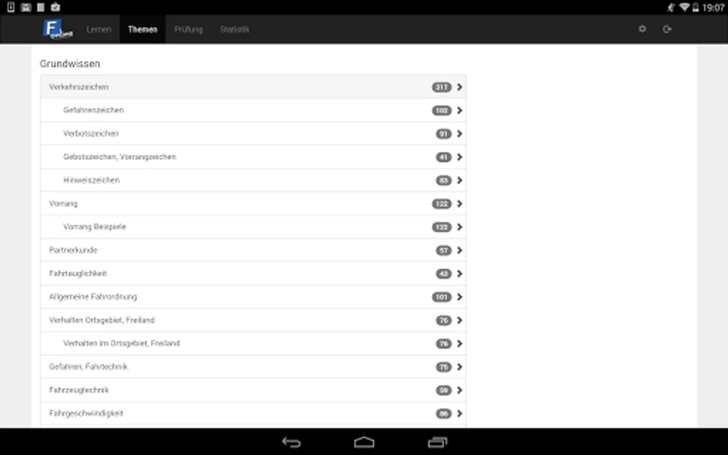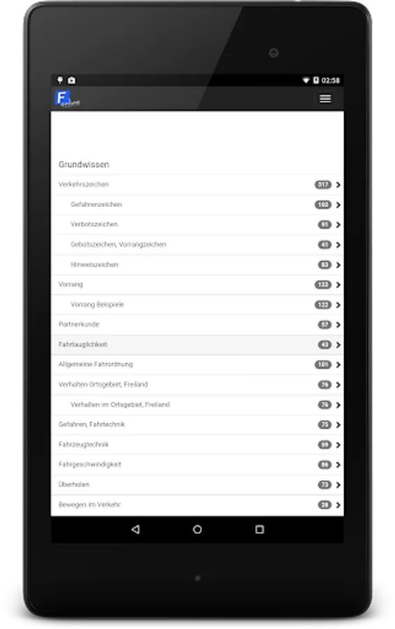 Registration and use of F-Online is completely free! You will learn the official exam questions which also are asked during exam, we get the questions directly from the department of transport. Currently, there are over 3,000 questions in various license categories (A, B, C, ...). Changes made by the department of transport are immediately updated to F-Online - the questions are therefore always up to date!