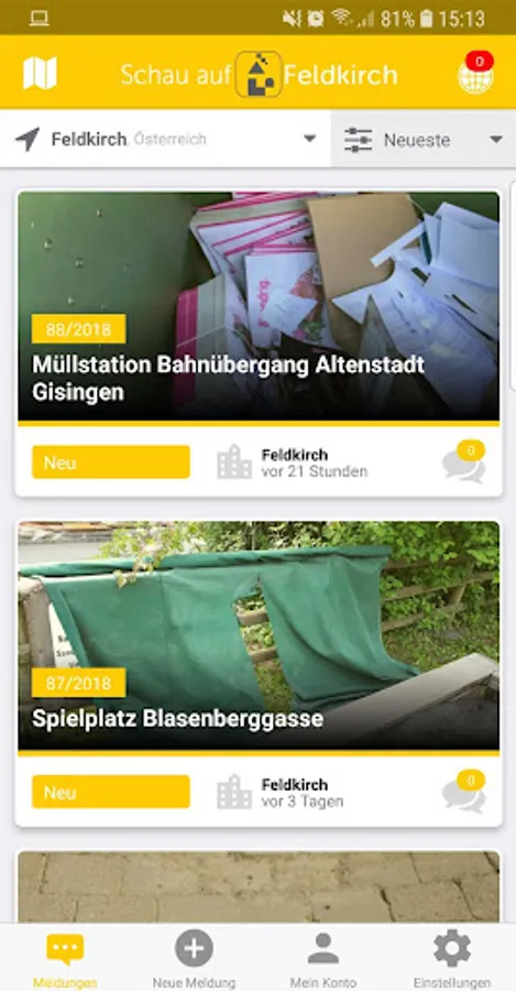 With the "Look at Feldkirch" app you can easily report the city your satisfaction, your suggestions and ideas, as well as defects in the public space of the city. Everything you notice positively or negatively in Feldkirch is unbureaucratic sent here to the responsible employees of the city of Feldkirch for editing. The staff will endeavor to correct the deficiencies quickly. Overview of all messages for all users are presented openly and transparently. The status of messages is updated continuously.