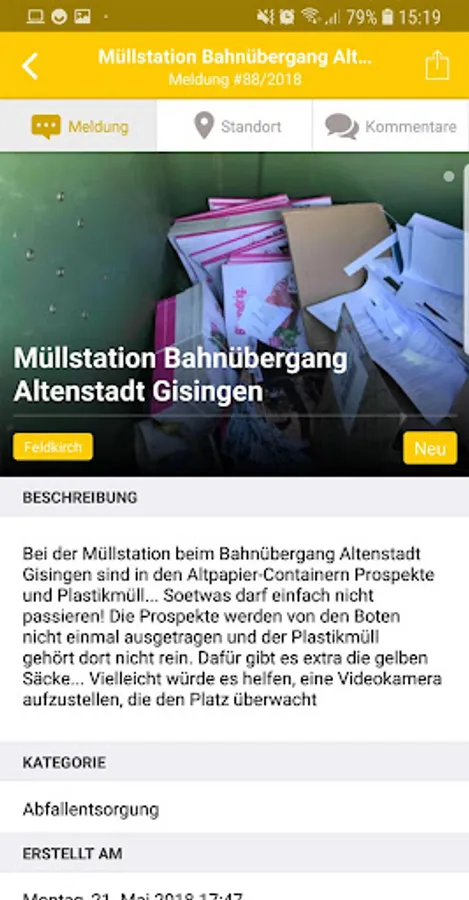 Every note is welcome. In this case, the automatically identifiable GPS position and uploadable images from your mobile phone or smartphone to help. Comments on individual messages serve the communication. Help us to make Feldkirch even more liveable.