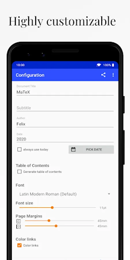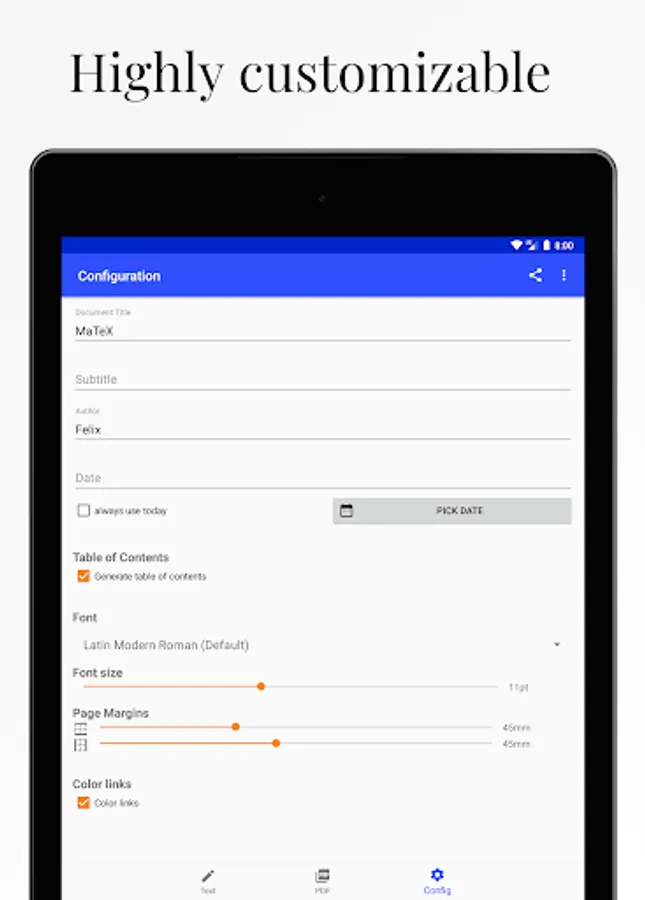 Document title, subtitle, author, date, font, font-size, page margins and more.