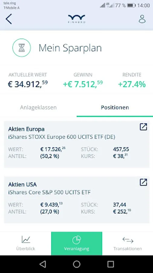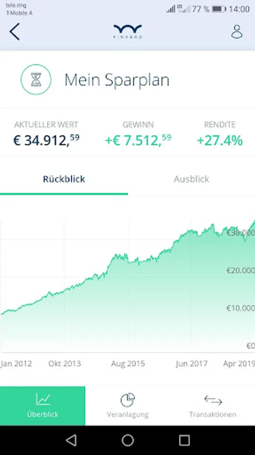 With the FINABRO app you have anywhere, around the clock access to your FINABRO accounts. You have an overview of the current amount of your investment, the composition of your portfolio and more. Fast access is guaranteed by simple operation using the fingerprint sensor.