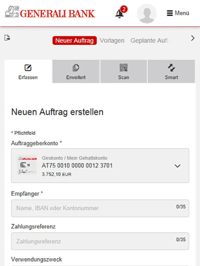 - Transfers (domestic and SEPA area) and standing orders using smartID as well as transfers between your own accounts