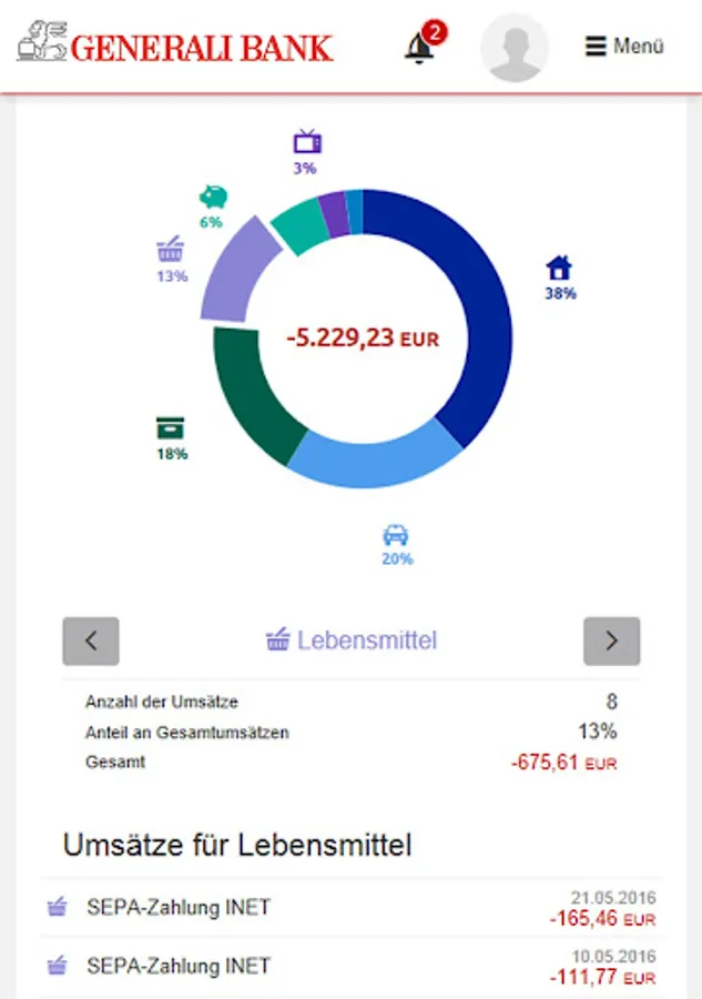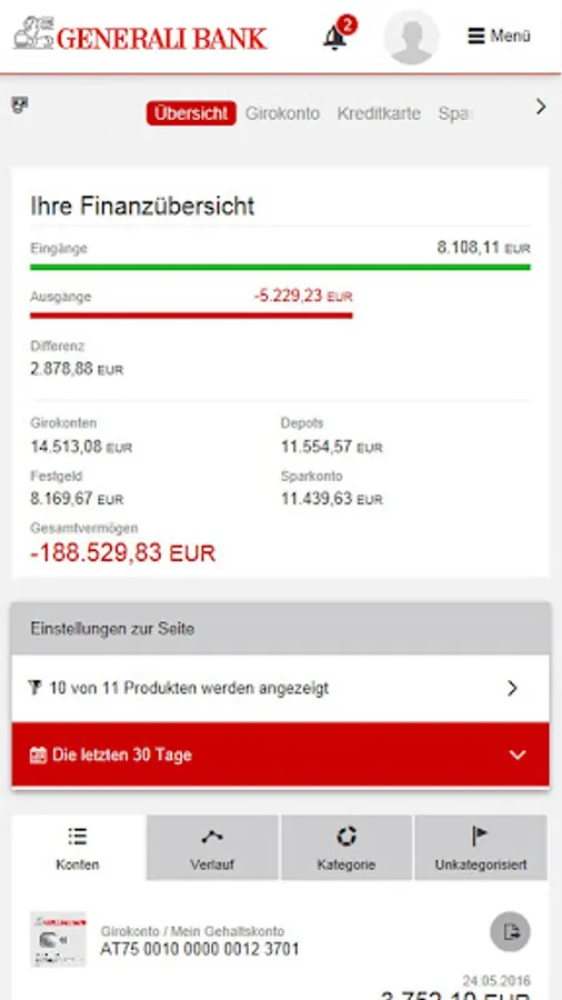 - Overview of all accounts at Generali Bank including quick check option and simple turnover search