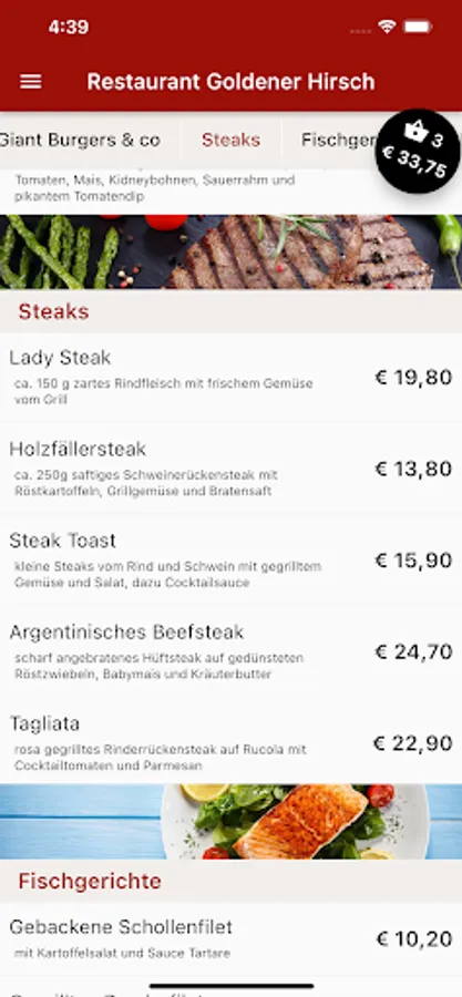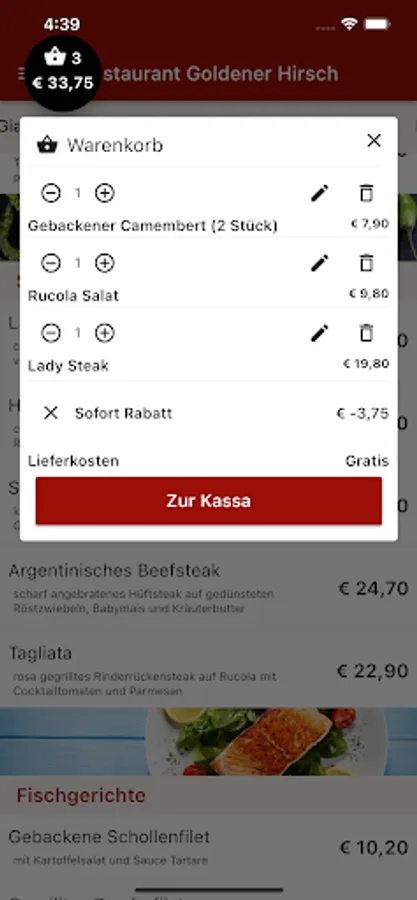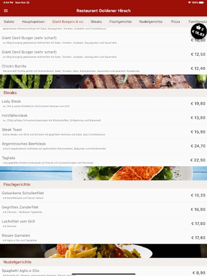 Goldener Hirsch now also delivers to your home. Order Italian pizza, steaks, salads, drinks and desserts conveniently and easily online. Now simply order food online via the web or via the app. Choose your favorite food, pay easily & securely and food will be delivered! Simply order food and have it delivered for free! Pay in cash or online. Great offers. Excellent service. Fast delivery.