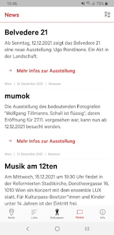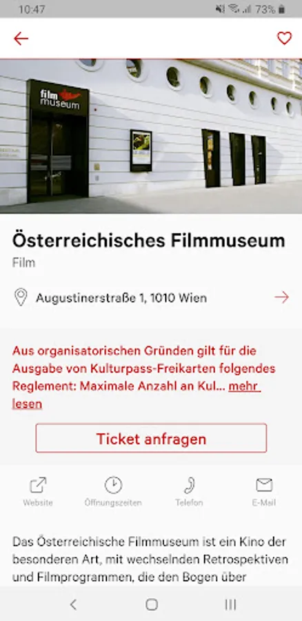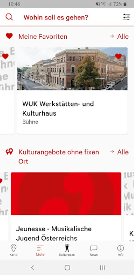 The culture pass is an identity card that enables people with little money to use cultural offers in over 1200 cultural institutions in Austria with free admission. The Kulturpass APP presents you with a wide range of cultural offerings from the Hunger for Art and Culture campaign. A street map shows the nearest cultural institutions, which can be visited with free admission. You can search for cultural categories (museum, stage, music, library ...) but also for keywords (opera, theater, dance, nature / environment etc.). There are also details on the individual cultural institutions, such as the usage modalities of the culture pass. A memory function makes it possible to mark personal favorites. Every Kulturpass holder has the option of scanning their Kulturpass in order to present it digitally at the cash desk with a photo ID. Ticket inquiries by email are also possible. The APP is available in German. Features: road map, information on the cultural institutions, favorites function, information on the culture pass in general, culture pass scan function, various sorting options, news