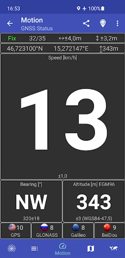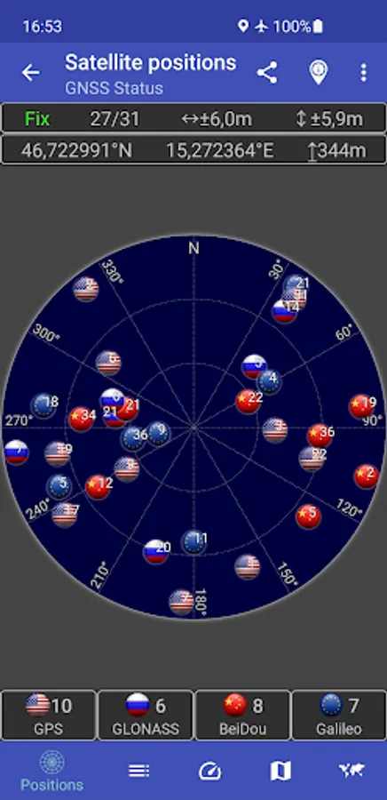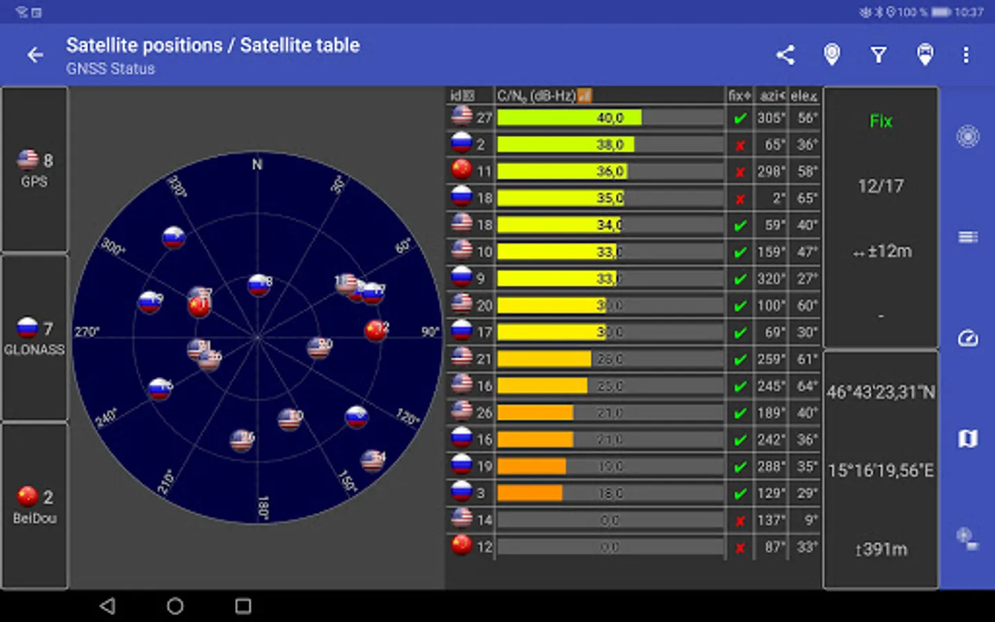 This app is a tool for displaying the GPS status and the status of other GNSS (global navigation satellite systems). It provides all information about all GNSS supported by your device (GPS, GLONASS, Galileo, BeiDou, ...).