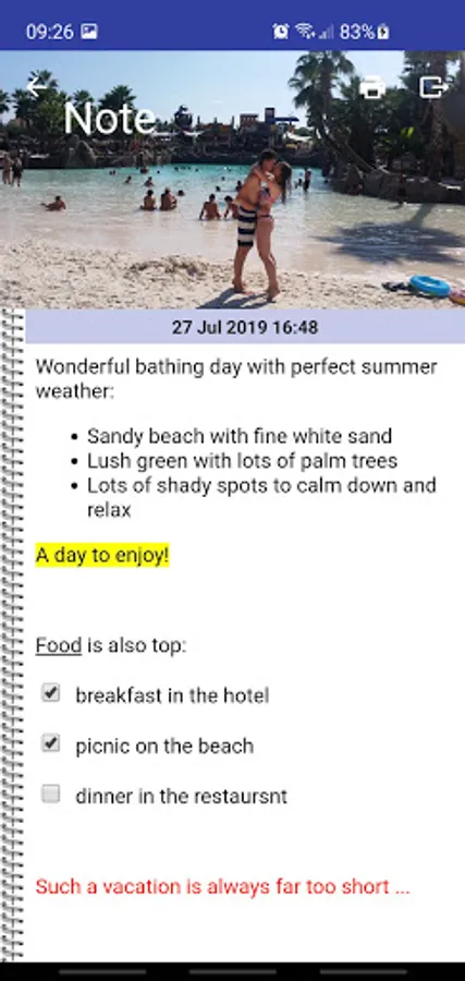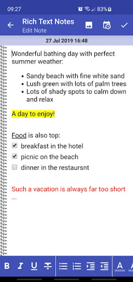 Rich Text Notes can be used as a simple notebook, but also as a diary, shopping list or todo list, for example. As a special feature, our app offers the option of creating your notes with formatting, not just plain text. Rich Text Edit also allows you to keep as many different notebooks as you want. With this app you can easily record and organize all your notes, activities, events, appointments, experiences, ideas, flashes of genius and little secrets throughout the day.