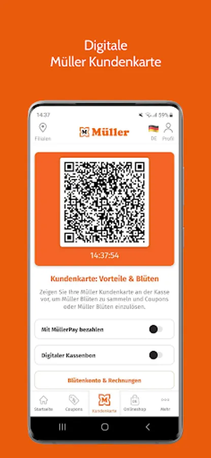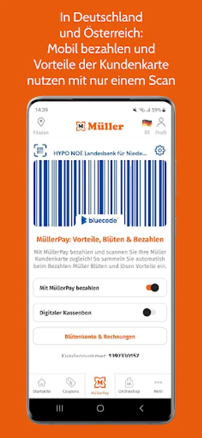 In Germany and Austria MüllerPay: MüllerPay is the mobile payment method offered by Müller for paying in Müller branches with the Müller app. With MüllerPay you can have your digital customer card scanned and make contactless payments at the same time. In this way, you automatically collect Müller Blossoms during the payment process and redeem benefits. The mobile payment method Bluecode makes this technically possible.