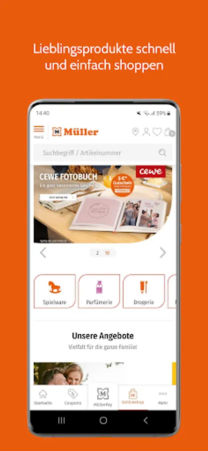 Online shop: In the app you can browse our product categories as usual, search for specific items from our range and shop directly. Müller is more than just a drugstore - you will find all product ranges in the online shop: drugstore, perfumery, natural shop, toys, stationery, multimedia, household items, stationery and stockings.