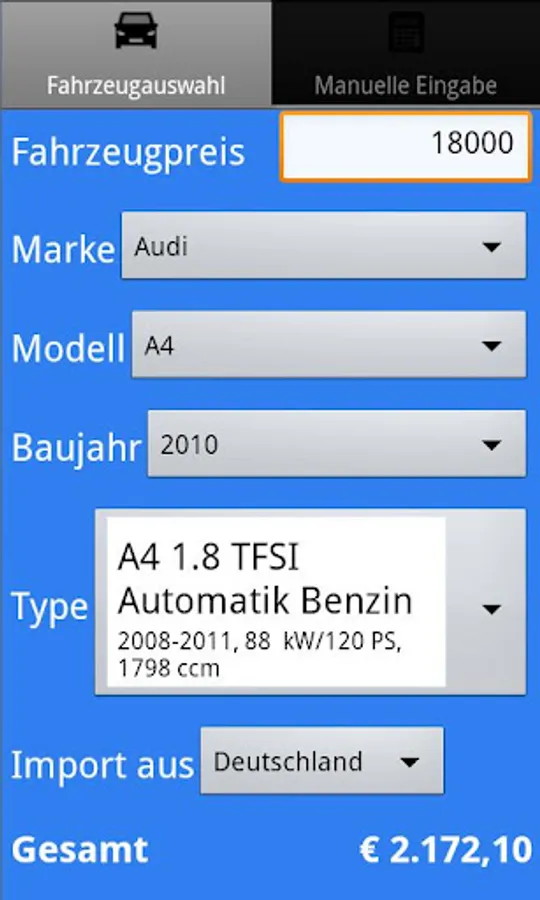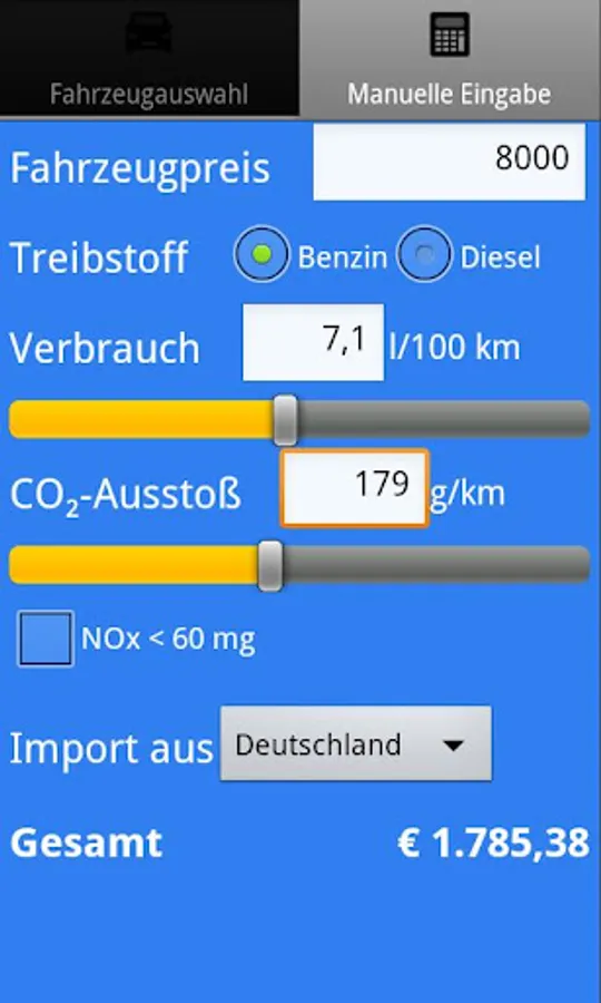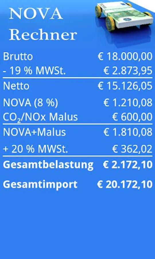 Calculate the NOVA (consumption tax), CO2 taxes, Bonus / Malus for vehicle imports. The app calculated according to the current legal requirements. The expected new CO2-based Nova calculation for new registrations from March 2014 is also included. By clicking on the calculated tax amount, you can view the detailed overview of the individual tax positions.
