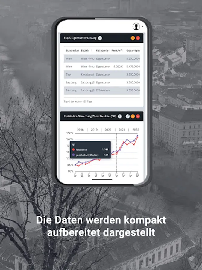 The data obtained from different sources are brought together, analyzed and presented in a compact format. In addition to the real estate price index of the WKO Association of Real Estate and Asset Trustees, the basis is formed by the real estate purchase prices, the real estate market reports and the real estate rental prices of the ZT Datenforum as well as data from Statistics Austria, from public data collections and administrative levels.