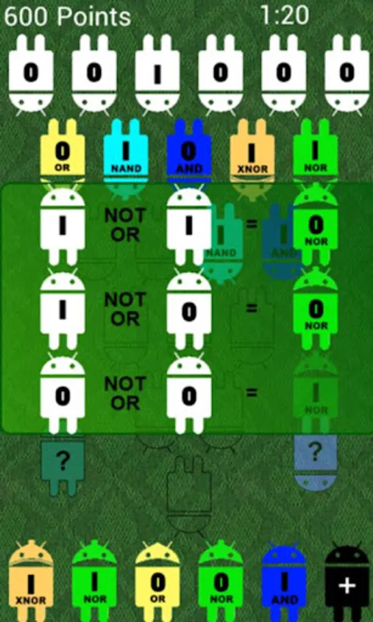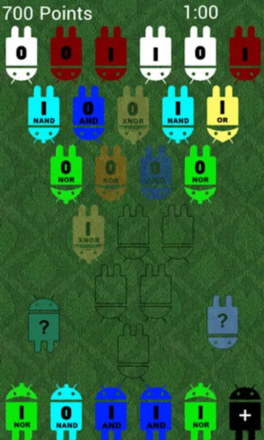 Boolitaire is a strategic card game based on Boolean logic. Starting from a given bit string you have to establish a pyramid of logical gates. You achieve this by placing logical gates (represented by cards). A logical gate performs a Boolean operation on two inputs and returns a binary number. (1 or 0)