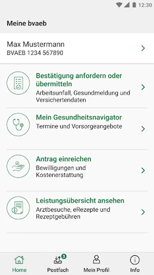 Submit invoices, display e-card data and co-insured persons, download insurance statements, display doctor's visits and view the prescription fee account - the BVAEB app offers all of this. Sure, with the mobile phone signature.