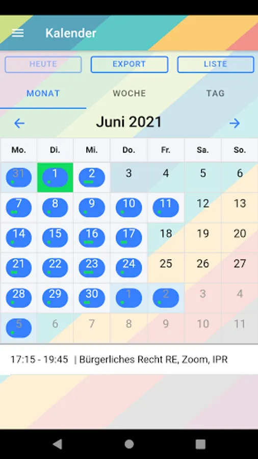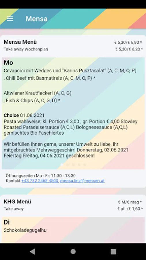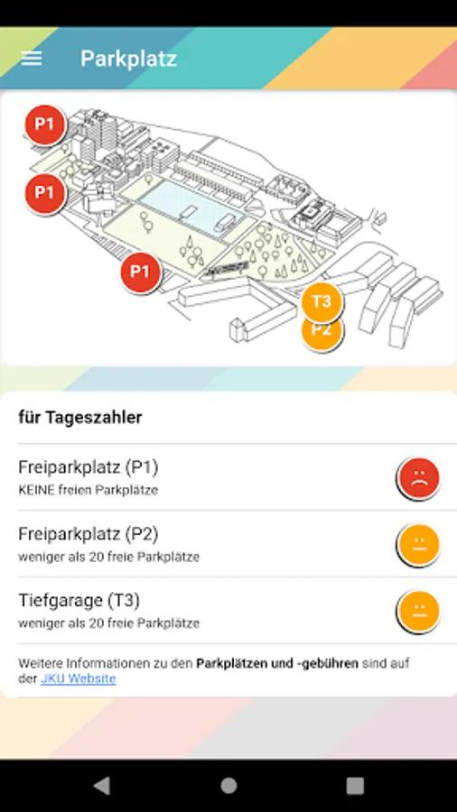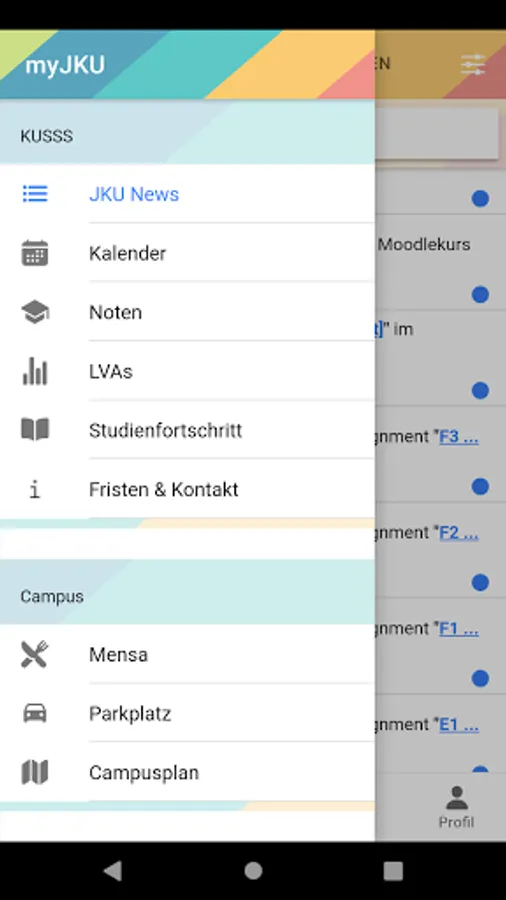 All appointments are available in a clear calendar as well as in a list view and can be exported. Of course you can see your grades and registered courses, as well as the current canteen menu, the campus map and the parking lot occupancy. You can also display important deadlines, such as the registration period and the most frequently required contacts to institutions at the JKU.