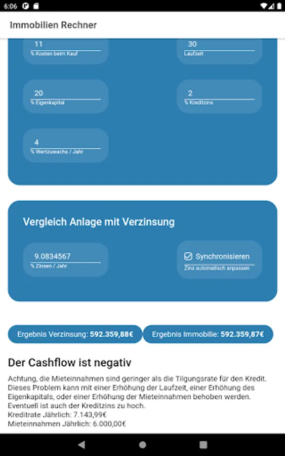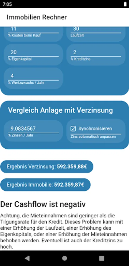 The real estate calculator of long-term values helps determine whether a real estate investment is profitable. For this, the purchase price of the property and the installment loan used are entered.