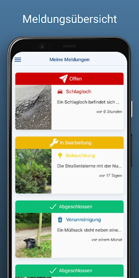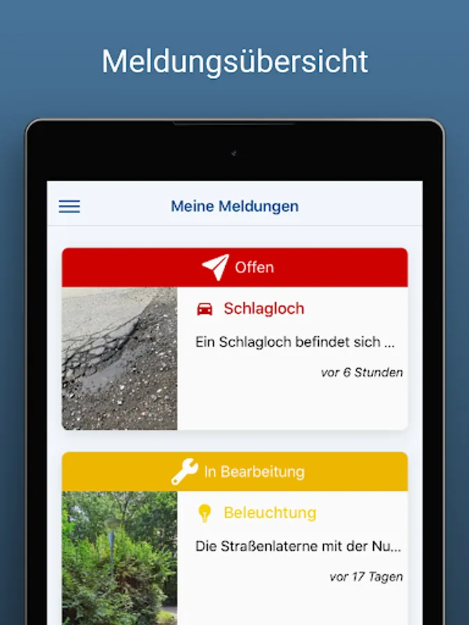 A broken street lamp, a pothole or a fallen tree due to a storm can be reported in no time thanks to the reporting app!