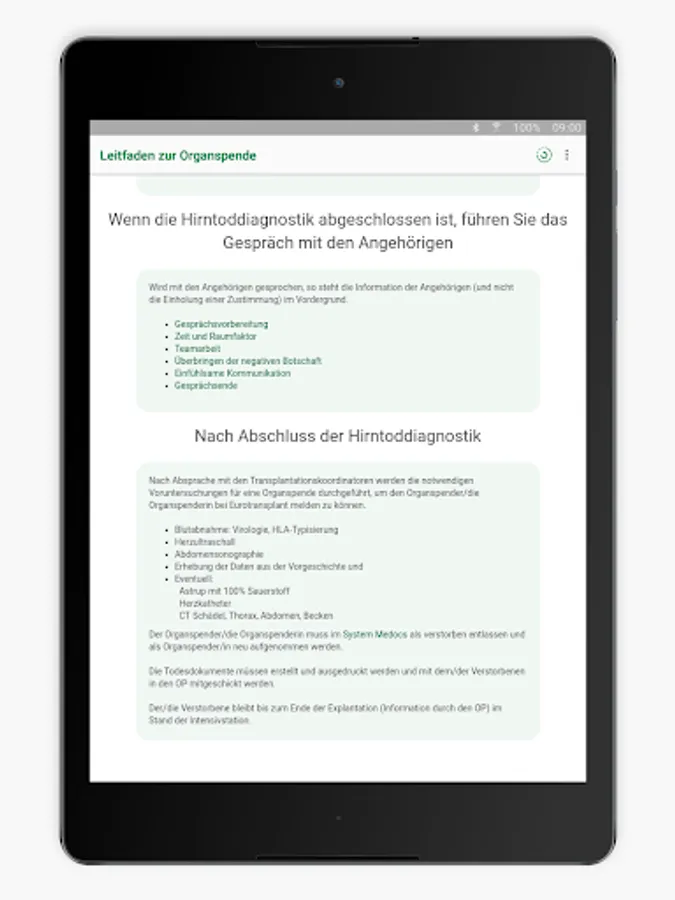The app is intended to give medical staff in intensive care units, that has to do with the process of organ donation after brain death, an aid for technical and organizational process. The app is designed so that it serves people with a lot of experience as a short checklist. People who have less experience, can get gradually more information, respectively. The app can also be used independently of an actually occurring organ donation to information and education purposes.