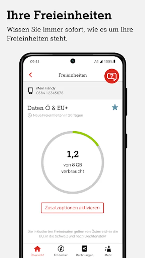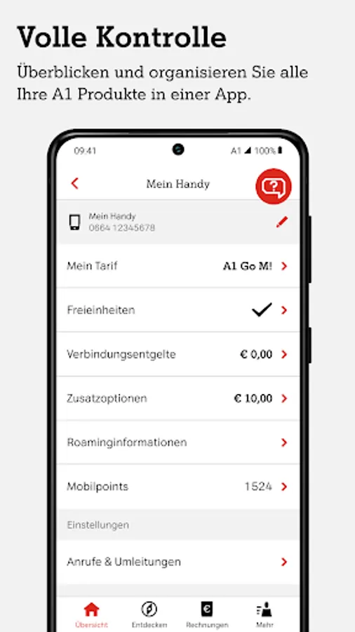 Overview: All your products directly on the start screen of the My A1 app. From there, you can call up details on existing contracts, terms and connection charges. Book additional data packages directly in the app or upgrade your tariff. Top up your credit quickly and easily. Set limits for your data consumption with cost control. And forward calls to voicemail or a phone number.