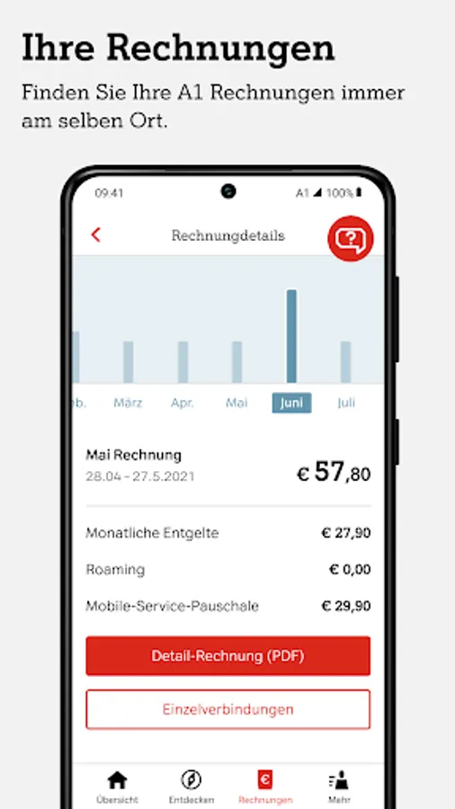 Invoices: The Mein A1 app shows the costs of the last six months in a clear and understandable way. Download detailed invoices as PDF.