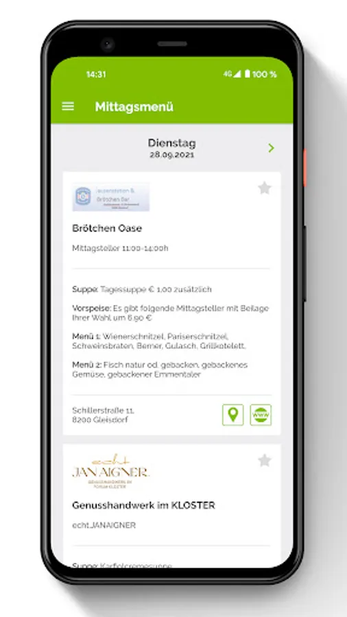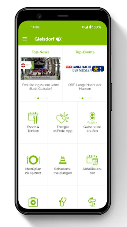 Individual waste calendar. Suggestions regarding road damage, lighting or playgrounds. Event calendar with direct ticket booking function and reminder in your own calendar. Regardless of whether it concerns the municipality, the municipal utilities, the service center, the ticket office or the depot, your request will be immediately forwarded to the right place! Which specialist has just opened? Which pharmacy is on call? Where are you going for lunch today and what is on the menu? With the Gleisdorf service app, your questions can be answered quickly and easily!