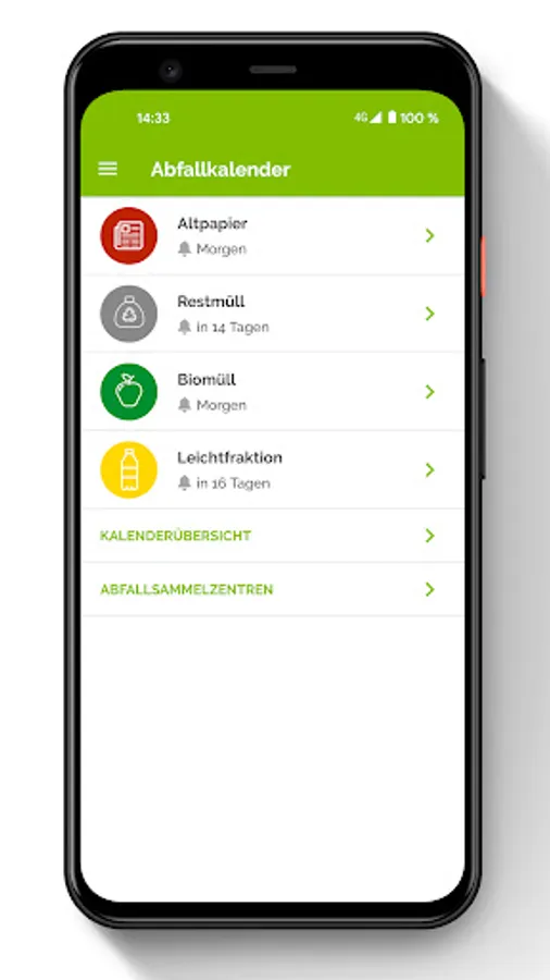 Personal waste calendar. Never miss a garbage collection again! In just a few steps you can register with your place of residence and see when waste paper, residual waste, light fraction and organic waste are picked up on your street. If you would like to be reminded of these appointments the day before - no problem. In addition, waste separation tips round off the range of apps.