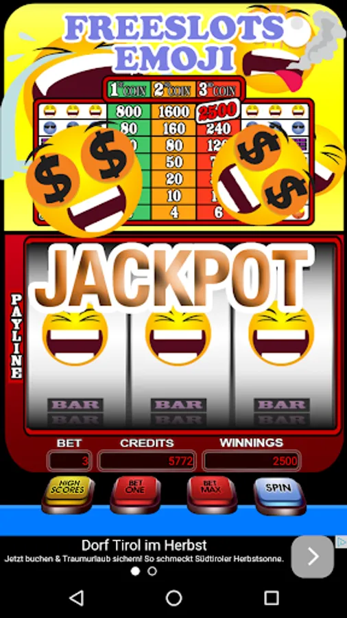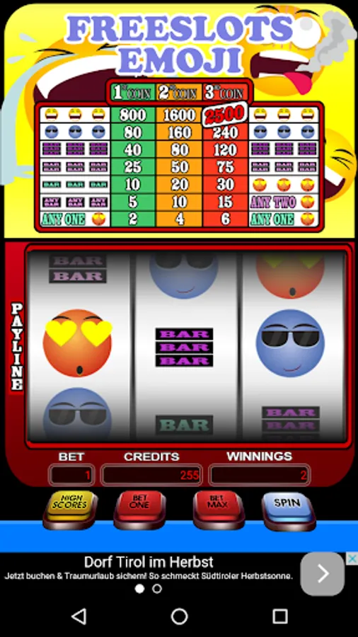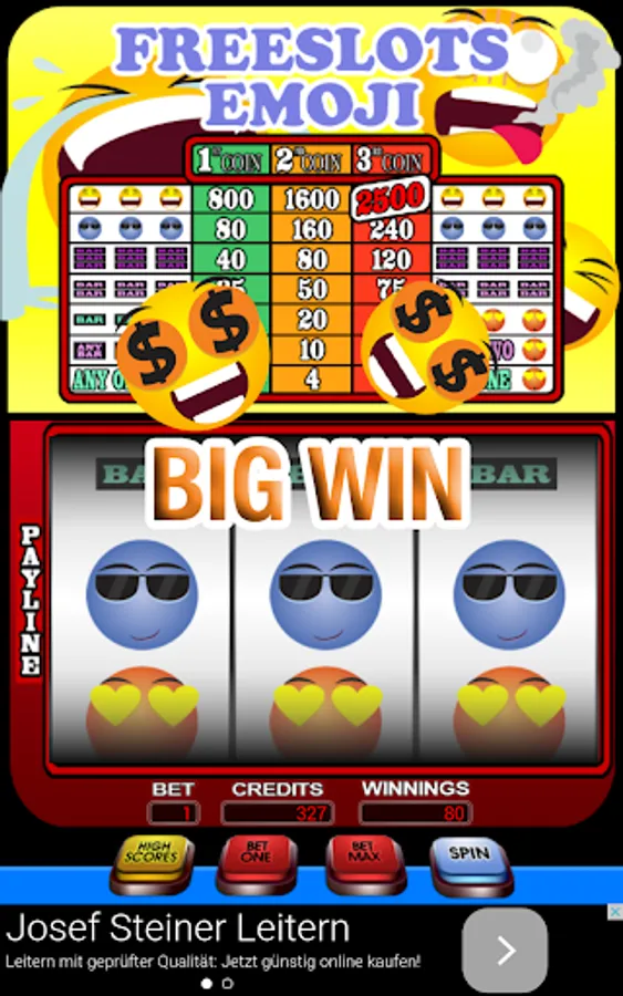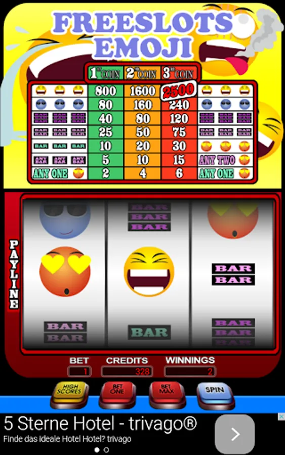 Freeslots Emoji is a classic 777 slots, emojis and BARs three line slot. Pennyslots with emoticons are genuine slots fun (classic slots)! Choose amount of coins you want to risk and tap SPIN. Double bets during casino gameplay to raise your big winnings. Play the best casino slots now! Easy to use slots interface in this famous slots machine with symbols like 777 vegas, smilies, BAR, Double BAR, Triple BAR. Use free casino credits to start your bets (up to 3 coins) and earn big wins in FREE Emoji Slotmachine.