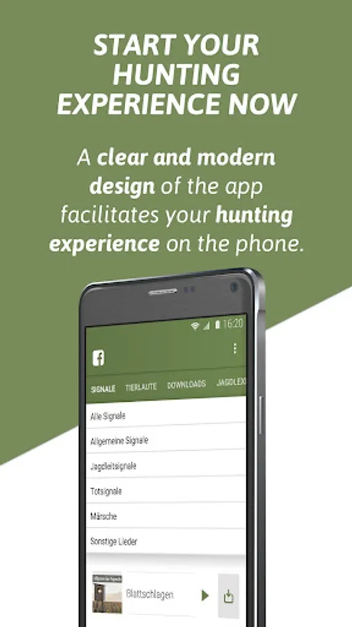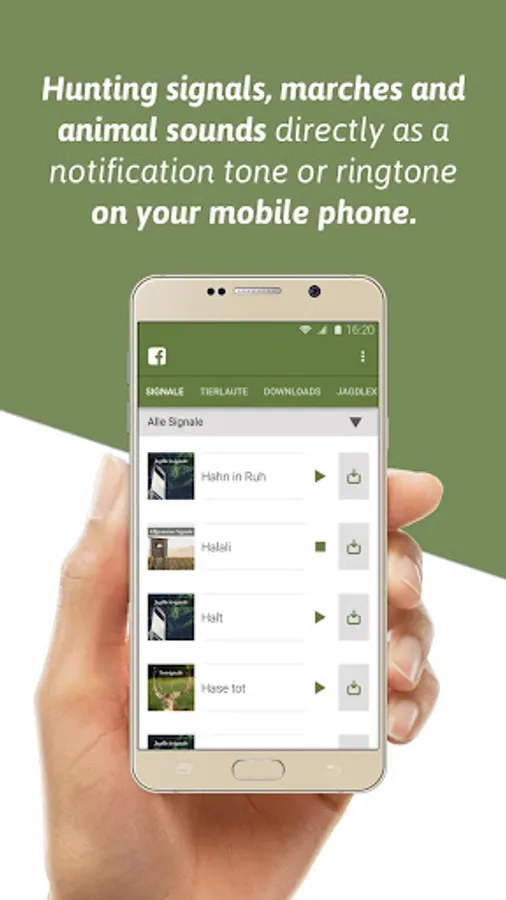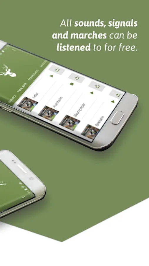 It is very easy to set the popular hunting sounds (hunting signals, hunting horn signals, hunting marches or animal sounds) as a ringtone, notification tone, SMS receive signal or alarm clock. The new Signal Manager provides a perfect overview of already downloaded sounds. There is the possibility via a one-time in-app purchase to get all sounds in the app.