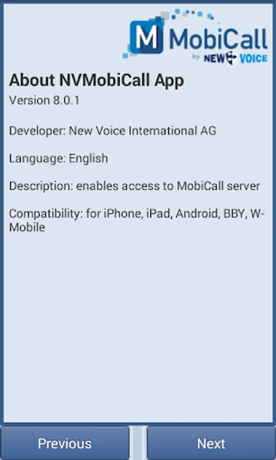 Note: this app has been designed to be used only in combination with a valid MobiCall license. For further information, please contact your New Voice representative or write to us at mobicall@newvoiceinternational.com